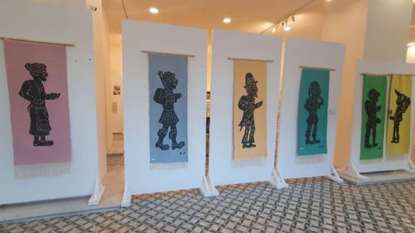 Δώδεκα εντυπωσιακά υφαντά, που έχουν κατασκευαστεί σε αργαλειό από τις γυναίκες της Κοινωνικής Συνεταιριστικής Επιχείρησης ΠΛΕΤΕΝΟ στην Ξάνθη, καθώς και μια συλλογή με τα ψηφιδωτά του Γιώργου Τσέκου, εμπνευσμένα από τους ήρωες του θεάτρου σκιών, δείχνουν πώς η παράδοση συναντά τη σύγχρονη καλλιτεχνική δημιουργία. Επιπλέον, εντυπωσιακές φιγούρες από μέταλλο και ξύλο αλλά και σκηνικά, όλα σχεδιασμένα από τον Απόστολο Δομτζίδη, συμπληρώνουν αυτή την εντυπωσιακή έκθεση.