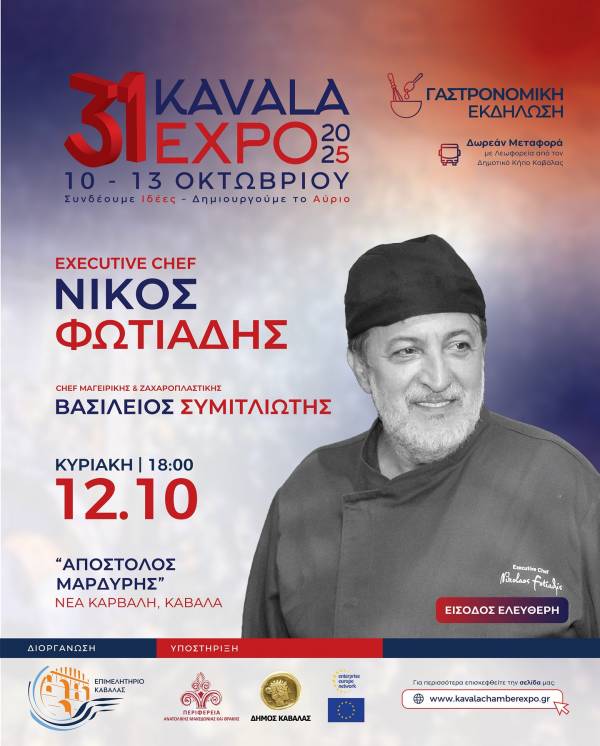 Την Παρασκευή 12 Οκτωβρίου, ο executive chef Νίκος Φωτιάδης θα βρίσκεται στο Εκθεσιακό Κέντρο «Απόστολος Μαρδύρης» για μια μοναδική γαστρονομική παρουσίαση!