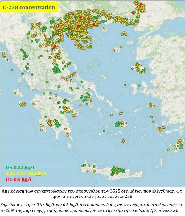 Στο χάρτη με την περιεκτικότητα σε ουράνιο-238 εμφανίζονται υψηλές συγκεντρώσεις πάνω από 0,6 Bq/L σε τρία σημεία της Ανατολικής Μακεδονίας και Θράκης: στην περιοχή Κάριανης και Παραλίας Οφρυνίου, στην περιοχή πάνω από το Δέρειο στον Έβρο και στην ευρύτερη περιοχή των Καστανιών στα ελληνοτουρκικά σύνορα.