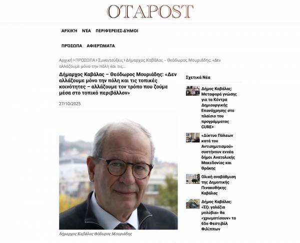 Στη συνέντευξή του στην OTAPOST, ο Δήμαρχος Καβάλας, Θεόδωρος Μουριάδης, παρουσιάζει το πολυδιάστατο έργο της δημοτικής αρχής που εστιάζει στις υποδομές, τις αστικές αναπλάσεις, το περιβάλλον και τον πολιτισμό. Από τα μεγάλα έργα ύδρευσης και αποχέτευσης έως τις παρεμβάσεις ενεργειακής αναβάθμισης, οδικής ασφάλειας και κοινόχρηστων χώρων, ο Δήμος Καβάλας διαμορφώνει ένα βιώσιμο και λειτουργικό αστικό περιβάλλον, βελτιώνοντας την ποιότητα ζωής των πολιτών.