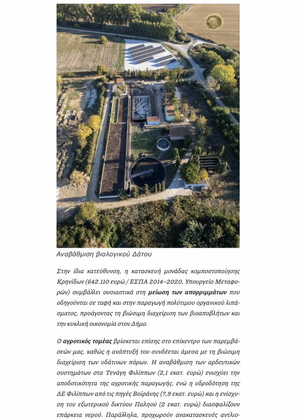 Η βελτίωση του περιβαλλοντικού αποτυπώματος αποτελεί ακόμη έναν πυλώνα του σχεδιασμού μας. Η κατασκευή μονάδας προχωρημένης ιλύος από τους βιολογικούς καθαρισμούς των Δήμων Καβάλας και Παγγαίου, προϋπολογισμού 12,9 εκατ. ευρώ (Ταμείο Ανάκαμψης), συμβάλλει καθοριστικά στη βιώσιμη διαχείριση των αποβλήτων. Παράλληλα, έργα όπως ο εκσυγχρονισμός της Εγκατάστασης Επεξεργασίας Λυμάτων Καβάλας (4,8 εκατ. ευρώ) και η αναβάθμιση του βιολογικού Δάτου (9,6 εκατ. ευρώ) ενισχύουν τον στόχο για προστασία του περιβάλλοντος και του υδάτινου πλούτου της περιοχής.