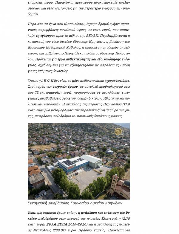 Συνολικά, ο συνδυασμός έργων της ΔΕΥΑΚ και των Τεχνικών Υπηρεσιών υπερβαίνει τα 153 εκατομμύρια ευρώ. Μέσα από διαφάνεια, σωστή διαχείριση πόρων και στρατηγικό προγραμματισμό, αποδεικνύουμε ότι η Καβάλα μπορεί να αναπτυχθεί με βιώσιμο, λειτουργικό και αποτελεσματικό τρόπο. Οι πολίτες πλέον βλέπουν στην πράξη τα οφέλη: καλύτερης ποιότητας νερό, ασφαλέστερους δρόμους, σύγχρονα σχολεία, χώρους πολιτισμού και αθλητισμού και αναβαθμισμένους κοινόχρηστους χώρους.