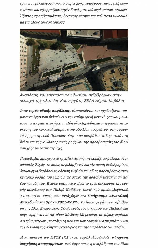 Από την πρώτη στιγμή που αναλάβαμε τη διοίκηση του Δήμου Καβάλας, είχαμε σαφή στόχο. Να βελτιώσουμε την καθημερινότητα των πολιτών και να δημιουργήσουμε υποδομές που να ανταποκρίνονται στις ανάγκες μιας σύγχρονης, λειτουργικής και βιώσιμης πόλης. Καθ’ όλη τη διάρκεια των τελευταίων έξι ετών, εργαστήκαμε με σχέδιο και προγραμματισμό, αξιοποιώντας ευρωπαϊκούς και εθνικούς πόρους. Το αποτέλεσμα είναι μια σειρά έργων ουσίας που αλλάζουν την εικόνα και τη λειτουργία του Δήμου Καβάλας.