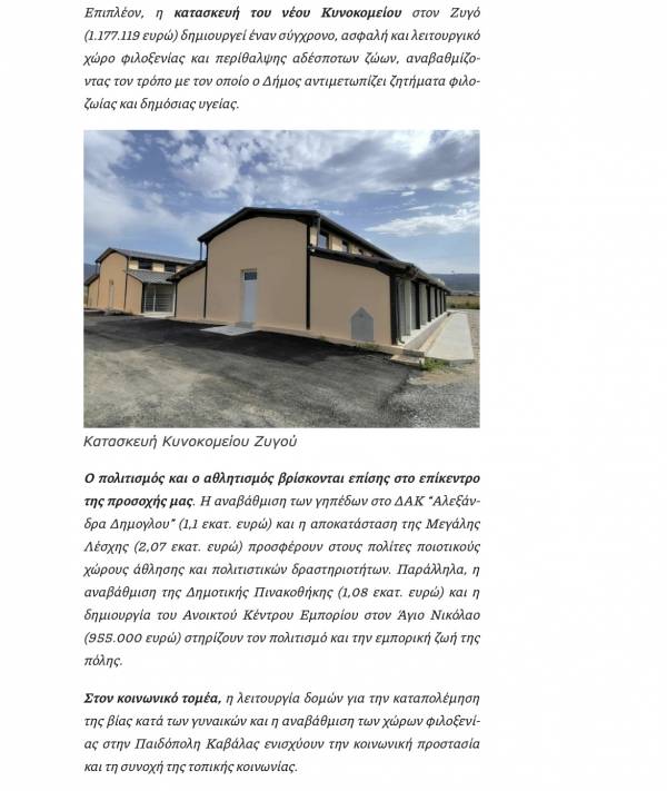 Επιπλέον, η κατασκευή του νέου Κυνοκομείου στον Ζυγό (1.177.119 ευρώ) δημιουργεί έναν σύγχρονο, ασφαλή και λειτουργικό χώρο φιλοξενίας και περίθαλψης αδέσποτων ζώων, αναβαθμίζοντας τον τρόπο με τον οποίο ο Δήμος αντιμετωπίζει ζητήματα φιλοζωίας και δημόσιας υγείας.