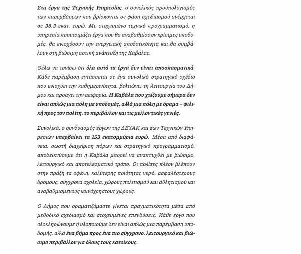 Θέλω να τονίσω ότι όλα αυτά τα έργα δεν είναι αποσπασματικά. Κάθε παρέμβαση εντάσσεται σε ένα συνολικό στρατηγικό σχέδιο που ενισχύει την καθημερινότητα, βελτιώνει τη λειτουργία του Δήμου και προάγει την αειφορία. Η Καβάλα που χτίζουμε σήμερα δεν είναι απλώς μια πόλη με υποδομές, αλλά μια πόλη με όραμα – φιλική προς τον πολίτη, το περιβάλλον και τις μελλοντικές γενιές.