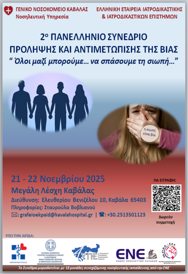 Η Οργανωτική Επιτροπή του 2ου Πανελλήνιου Συνεδρίου Πρόληψης και Αντιμετώπισης της Βίας έχει την τιμή να ανακοινώσει τη διεξαγωγή του συνεδρίου με τίτλο:  «Όλοι μαζί μπορούμε να σπάσουμε τη σιωπή…», που θα πραγματοποιηθεί στις 21 και 22 Νοεμβρίου 2025, στις 9 π.μ. στη Μεγάλη Λέσχη Καβάλας.