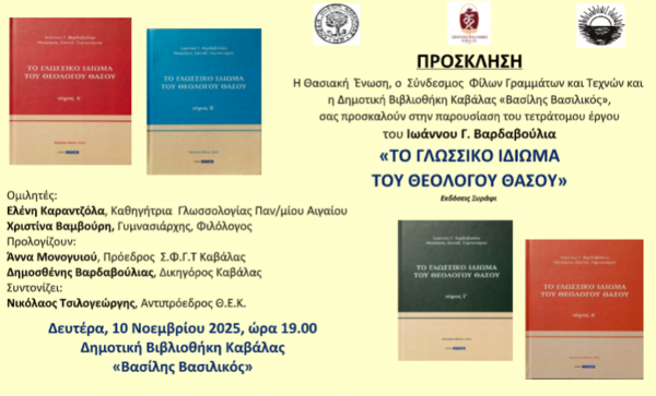 Ο Σύνδεσμος Φίλων Γραμμάτων και Τεχνών Καβάλας, η Θασιακή Ένωση, και η Δημοτική Βιβλιοθήκη Καβάλας "Βασίλης Βασιλικός" σας προσκαλούν την Δευτέρα 10 Νοεμβρίου 2025, ώρα 19.00 στη Δημοτική Βιβλιοθήκη Καβάλας "Βασίλης Βασιλικός" (Κασσάνδρου 6) στην παρουσίαση του τετράτομου έργου του αείμνηστου θεολόγου και γυμνασιάρχη Ιωάννη Γ. Βαρδαβούλια (1934-2022) που έχει τίτλο "Το γλωσσικό ιδίωμα του Θεολόγου Θάσου".