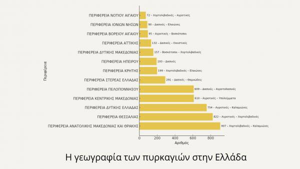 Σύμφωνα με τα στοιχεία η Περιφέρεια Ανατολικής Μακεδονίας και Θράκης (ΑΜΘ) έρχεται πρώτη σε πανελλαδικό επίπεδο με 907 πυρκαγιές ενώ ακολουθεί η Θεσσαλία με 822 πυρκαγιές.