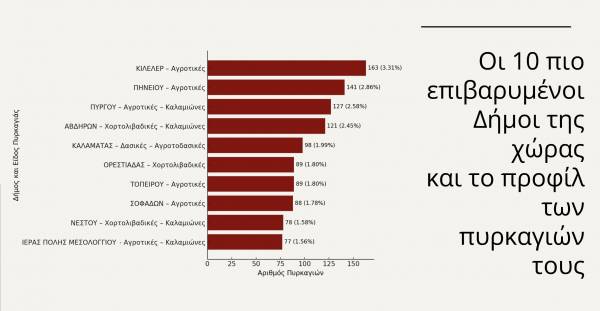 Σε επίπεδο τοπικής διοίκησης, δέκα Δήμοι συγκεντρώνουν περίπου 22 % του συνολικού αριθμού πυρκαγιών της χώρας, κυρίως στις Περιφέρειες Θεσσαλίας, Δυτικής Ελλάδας και Ανατολικής Μακεδονίας και Θράκης. Το κυρίαρχο είδος πυρκαγιάς στους εν λόγω Δήμους είναι αγροτικό ή χορτολιβαδικό, με χαρακτηριστικά μικρής έκτασης αλλά υψηλή συχνότητα επανεμφάνισης.
