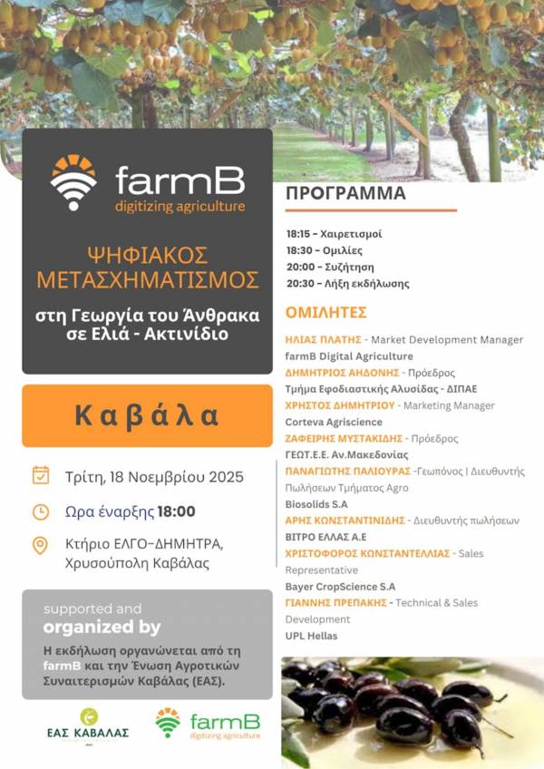 Η εταιρεία farmB Ψηφιακή Γεωργία Α.Ε.και η Ε.Α.Σ. Καβάλας σας προσκαλούν στην εκδήλωση με τίτλο: «Ψηφιακός Μετασχηματισμός στη Γεωργία του Άνθρακα σε Ελιά & Ακτινίδιο».