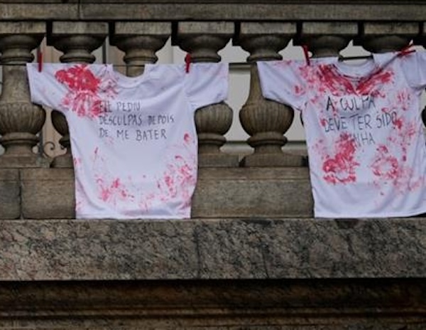 Μπλούζες βαμμένες με κόκκινο μελάνι, ως εναντίωση στις γυναικοκτονίες, κρεμασμένες έξω από το δημοτικό συμβούλιο του Ρίο ντε Τζανέιρο στη Βραζιλία (Silvia Izquierdo/AP)Μπλούζες βαμμένες με κόκκινο μελάνι, ως εναντίωση στις γυναικοκτονίες, κρεμασμένες έξω από το δημοτικό συμβούλιο του Ρίο ντε Τζανέιρο στη Βραζιλία (Silvia Izquierdo/AP)