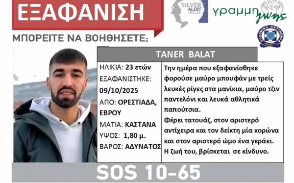 Σύμφωνα με ανακοίνωση της Γραμμής Ζωής, ο Taner Balat, εξαφανίστηκε στις 9 Οκτωβρίου 2025. Έχει μαύρα πυκνά μαλλιά, μούσι, μουστάκι, σκούρα καστανά μάτια, ύψος 1,80μ και είναι αδύνατος. Φέρει τατουάζ, στο αριστερό του χέρι στον αντίχειρα και τον δείκτη μία κορώνα και στον αριστερό του ώμο ένα γεράκι.