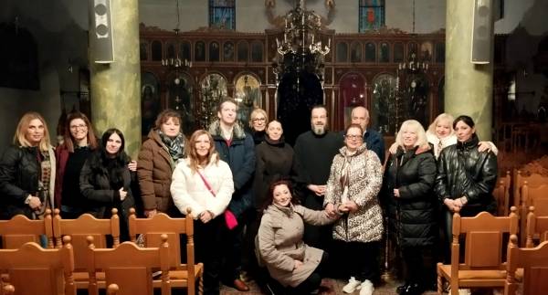 Οι εκπαιδευόμενοι και οι εκπαιδευτές πληροφορήθηκαν το ευρύ πρόγραμμα ανακαίνισης του ιερού ναού και θαύμασαν τα υπέροχα βιτρώ που έχουν τοποθετηθεί στα παράθυρα και στον τρούλο του ναού.