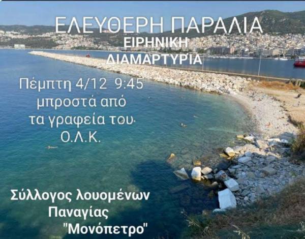 Ο Σύλλογος Λουομένων Παναγίας την Πέμπτη 4/12, στις 9.45 το πρωί διοργανώνει ειρηνική διαμαρτυρία μπροστά στα γραφεία του Ο.Λ.Κ. και συγκεκριμένα την ώρα της διεξαγωγής του πλειοδοτικού διαγωνισμού των ενδιαφερόμενων για την παραχώρηση της ακτής Ελικοδρομίου κάτω από τον Φάρο της Παναγίας.