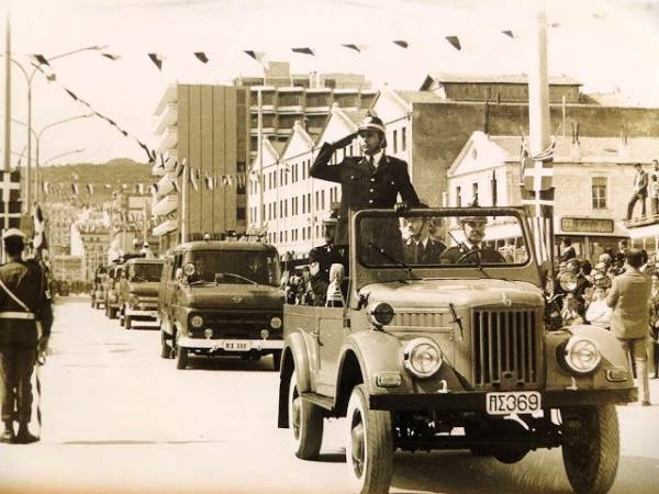 Στο Πυροσβεστικό Σώμα υπηρέτησε ο καλός μου φίλος Δημοσθένης Σιούλας στην δική του φωτογραφία, από παρέλαση στην οδό Ερυθρού Σταυρού στην δεκαετία του 1980, είναι πίσω από τον διοικητή που χαιρετά πλησιάζοντας στην εξέδρα των επισήμων, νέος τότε αρχιπυροσβέστης της σχολής.