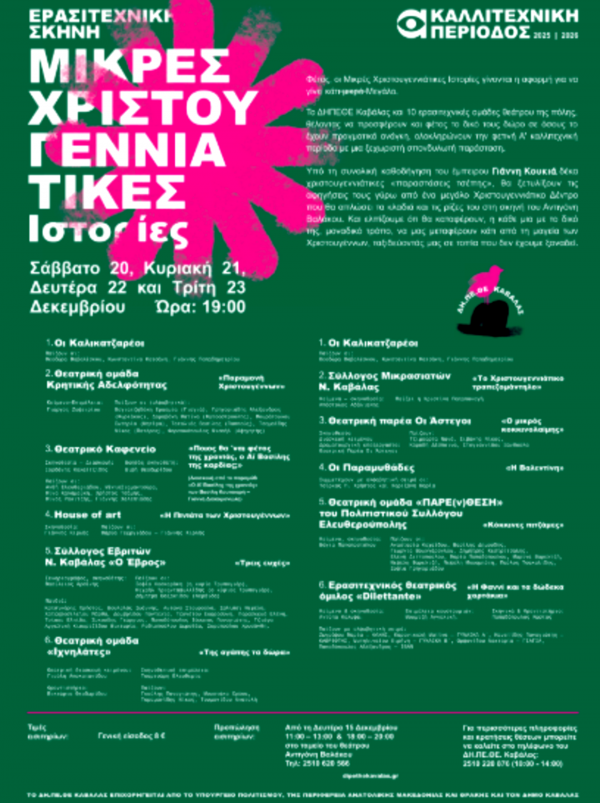 Το ΔΗ.ΠΕ.ΘΕ. Καβάλας και 10 ερασιτεχνικές ομάδες θεάτρου του νομού, παρουσιάζουν το Σάββατο 20, την Κυριακή 21, τη Δευτέρα 22 και την Τρίτη 23 Δεκεμβρίου στις 7 το απόγευμα στο θέατρο Αντιγόνη Βαλάκου, μία ξεχωριστή σπονδυλωτή παράσταση με τίτλο «Μικρές Χριστουγεννιάτικες Ιστορίες».