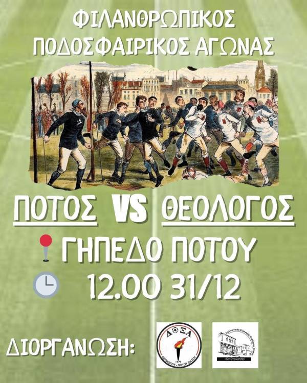Την Τετάρτη 31 Δεκεμβρίου θα γίνει ένας φιλανθρωπικός αγώνας ποδοσφαίρου στο γήπεδο του Ποτού της Θάσου στις 12:00 το μεσημέρι.