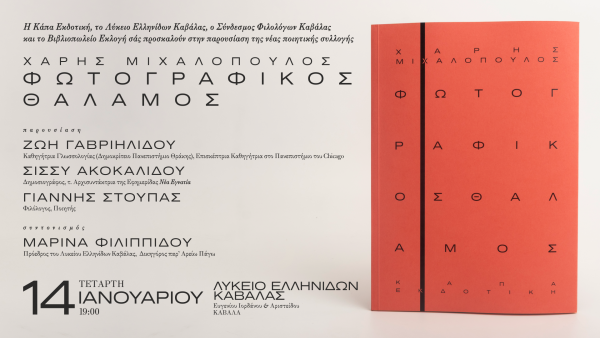 Η Κάπα Εκδοτική, το Λύκειο Ελληνίδων Καβάλας, ο Σύνδεσμος Φιλολόγων Καβάλας και το Βιβλιοπωλείο «Εκλογή» σας προσκαλούν στην παρουσίαση της νέας ποιητικής συλλογής του Χάρη Μιχαλόπουλου «Φωτογραφικός Θάλαμος» την Τετάρτη 14 Ιανουαρίου στις 7μμ. στην αίθουσα εκδηλώσεων του Λυκείου Ελληνίδων Καβάλας.