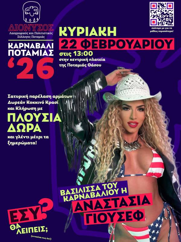«Καρναβάλι Ποταμιάς ’26, Κυριακή 22 Φεβρουαρίου στις 13:00 στην κεντρική πλατεία της Ποταμιάς Θάσου.