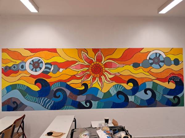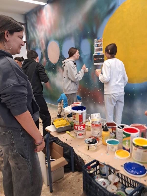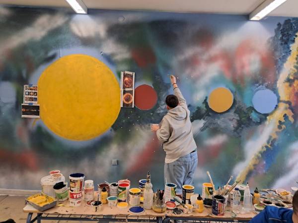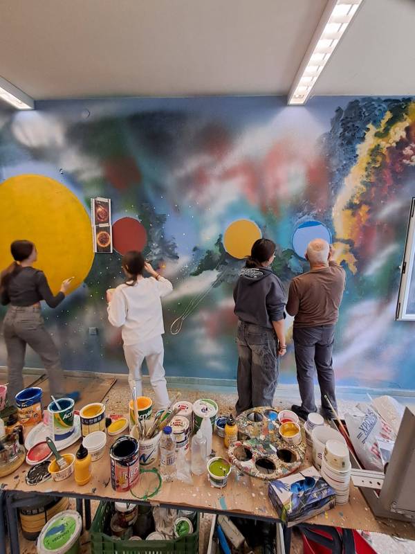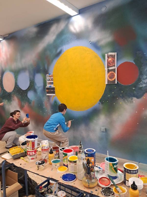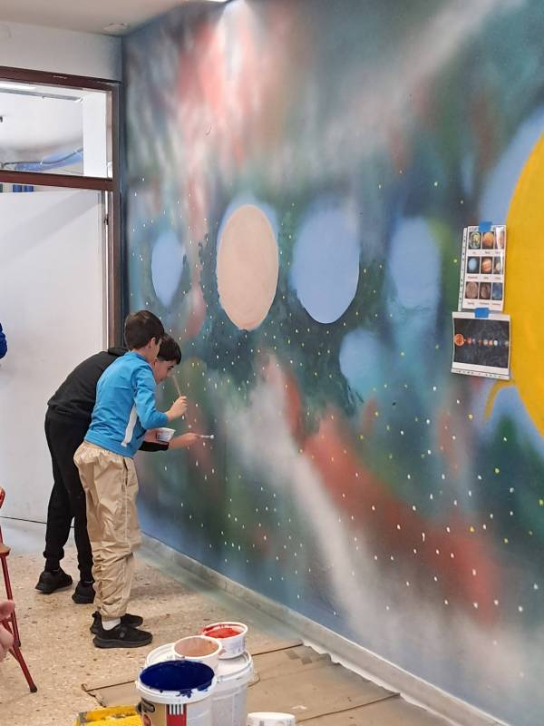 Ο Καβαλιώτης εικαστικός μαζί με τους μαθητές και τους γονείς ζωγράφισαν τους πλανήτες, μία Δύση του ήλιου και ένα τοπίο.