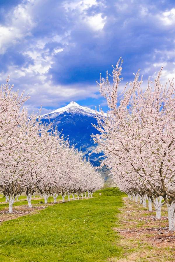 Βλέπουμε τις αντιθέσεις του Μαρτίου. Τη χιονισμένη κορυφή του βουνού και κάτω τις αμυγδαλιές που έχουν ανθίσει.