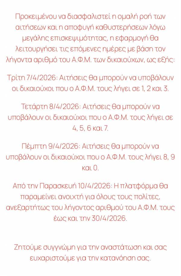 «Προκειμένου να διασφαλιστεί η ομαλή ροή των αιτήσεων και η αποφυγή καθυστερήσεων λόγω μεγάλης επισκεψιμότητας, η εφαρμογή θα λειτουργήσει τις επόμενες ημέρες με βάση τον λήγοντα αριθμό του Α.Φ.Μ. των δικαιούχων, ως εξής: