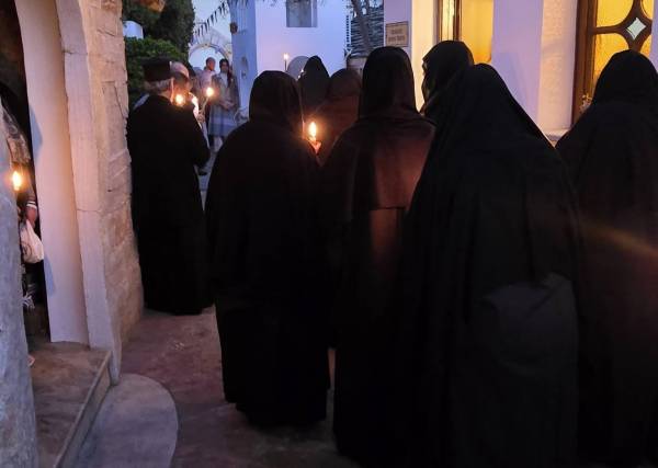 Μια παράδοση που χάνεται στα βάθη των αιώνων και συγκεκριμένα στα πρώτα χρόνια της Τουρκοκρατίας. Το μεσημέρι της Δεύτερης ημέρας του Πάσχα οι πιστοί που θα συνοδέψουν τον Άγιο συγκεντρώνονται στο Μετόχι, κατόπιν παραλαμβάνουν τα εξαπτέρυγα των Αγίων από τις δύο ενοριακές εκκλησίες, Αγία Παρασκευή και Άγιο Δημήτριο και όλοι μαζί με ορεινή πορεία περίπου 11 χιλιομέτρων προσεγγίζουν το μοναστήρι, όπου τους υποδέχονται οι καλόγριες με πλήθος κόσμου που συρρέει εκεί για να προσκυνήσει. Ο Άγιος διανυκτερεύει εκεί και μαζί του όποιος επιθυμεί.