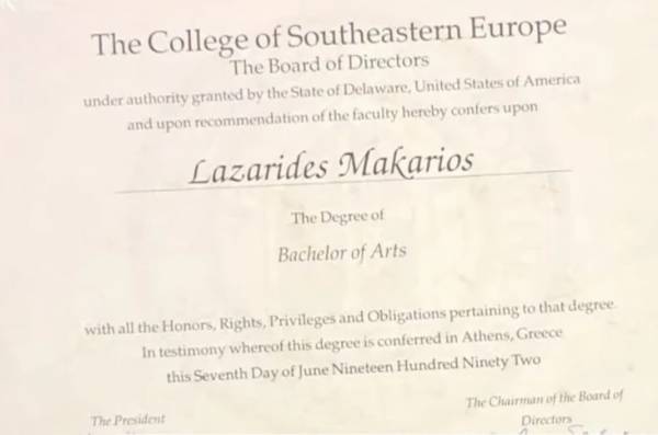 Ο κ. Λαζαρίδης μιλώντας στο OPEN παρουσίασε το πτυχίο του καθώς και φωτογραφίες από τα κτίρια του κολεγίου. «Το 1987 έκανα μία συνειδητή επιλογή, σε ηλικία 18 ετών, να σπουδάσω σε ένα κολέγιο, στο κολέγιο of the Southeastern Europe, ένα από τα δύο μεγαλύτερα κολέγια τότε στην Ελλάδα. Πήγα με τις κόρες μου να το φωτογραφίσω, ένα από τα κτήρια ήταν στην λεωφόρο Αμαλίας, είχε κτήριο στην Κηφισιά που σήμερα είναι γκαλερί, είχε κτήριο που σήμερα είναι νηπιαγωγείο, ένα κτήριο που σήμερα είναι ναυτιλιακή εταιρεία και ένα μεγάλο κτήριο που σήμερα είναι αποθήκη στην εθνική οδό στη Βαρυμπόμπη.