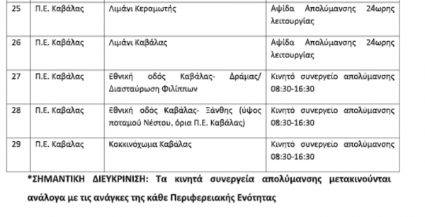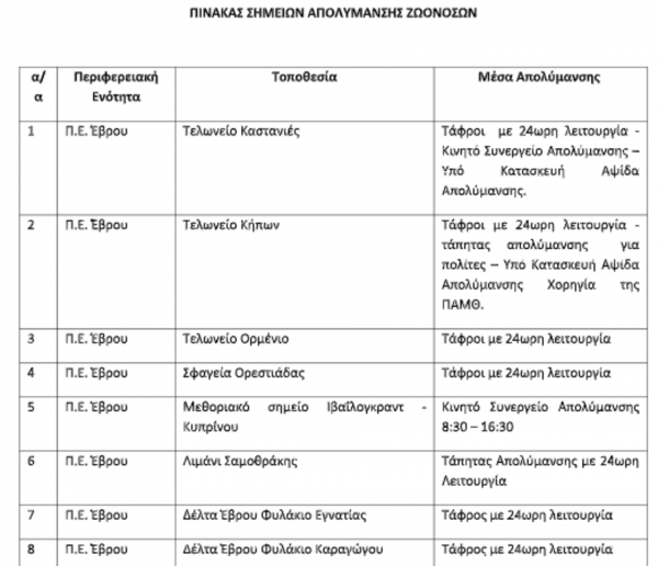 Στο πλαίσιο αυτό, λειτουργούν απολυμαντικές τάφροι, σημεία απολύμανσης και υγειονομικές πύλες, σύμφωνα με τον σχεδιασμό και στα καθορισμένα σημεία, που παρατίθενται παρακάτω σε πίνακα, διασφαλίζοντας αυξημένο επίπεδο πρόληψης και ελέγχου.