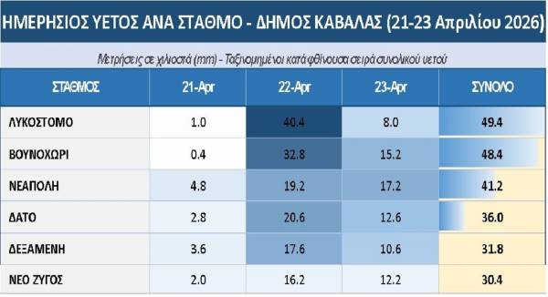 Σύμφωνα με το μετεωρολογικό δίκτυο του Δήμου Καβάλας, κατά τη διάρκεια των τελευταίων τριών ημερών τόσο στην πόλη, όσο και στις τοπικές κοινότητες, έπεσαν αξιόλογα ύψη βροχής, ενώ τοπικά παρατηρήθηκαν μεγάλα ύψη, πάνω από 40mm ή 40 λίτρα ανά τετραγωνικό μέτρο.
