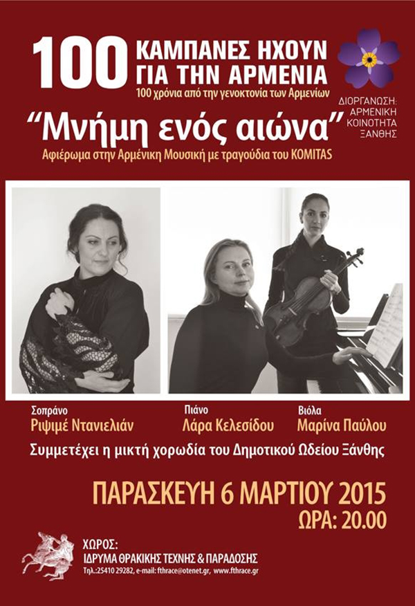 Στα πλαίσια των εκδηλώσεων που πραγματοποιούνται το 2015 σε όλο τον κόσμο για την συμπλήρωση 100 χρόνων από τις 24 Απριλίου 1915, που ξεκίνησε η Γενοκτονία των Αρμενίων από την Τουρκία, η Αρμενική Εθνική Επιτροπή, σε συνεργασία με την Αρμενική κοινότητα Ξάνθης, διοργανώνουν μια σειρά εκδηλώσεων στο Ίδρυμα Θρακικής Τέχνης και Παράδοσης για να τιμήσουν την μνήμη των θυμάτων της Γενοκτονίας, αλλά και για να διατρανώσουν την απόφαση και το δικαίωμά τους να ζουν, να θυμούνται, να καταδικάζουν και να διεκδικούν.