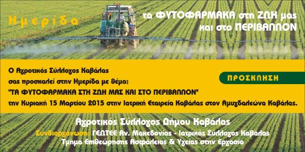 Ημερίδα με θέμα «Τα φυτοφάρμακα στη ζωή μας και στο περιβάλλον» διοργανώνει ο Αγροτικός Σύλλογος Δήμου Καβάλας την ερχόμενη Κυριακή 15 Μαρτίου. Η εκδήλωση θα πραγματοποιηθεί στην αίθουσα εκδηλώσεων της Ιατρικής Εταιρίας Καβάλας, στον Αμυγδαλεώνα.