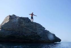 Εντυπωσιακές είναι βουτιές του 90χρονου μπάρμπα Νίκου από το Μονόπετρο. Τις βουτιές αυτές απαθανάτισε ο φακός του Αχιλλέα Σαββόπουλου ο οποίος γράφει σχετικά: