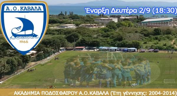 Την Δευτέρα 2 Σεπτεμβρίου στις 18:30 ξεκινάει η αγωνιστική χρονιά για όλα τα τμήματα της ακαδημίας ποδοσφαίρου (έτη γέννησης 2004-2014) του Α.Ο.Καβάλα, στο γήπεδο του ΑΟΚ πίσω από το κολυμβητήριο.