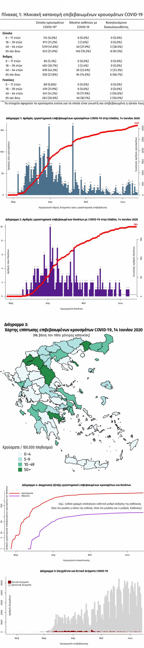 Στην τελευταία έκθεση επιδημιολογικής επιτήρησης λοίμωξης από το νέο κορωνοϊό (COVID-19) που έδωσε στη δημοσιότητα ο ΕΟΔΥ το απόγευμα της Κυριακής 14 Ιουνίου 2020 φαίνεται ότι ο συνολικός αριθμός των κρουσμάτων στη χώρα ανέρχεται σε 3.121, εκ των οποίων 55.1% άνδρες, ενώ οι θάνατοι ανέρχονται πλέον σε 183 (μέση ηλικία 76 έτη). Σημειώνεται ότι νοσηλεύονται διασωληνωμένοι 13 ασθενείς (οι 9 άνδρες).