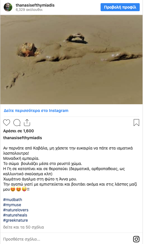 Στο πηλοθεραπευτήριο Κρηνίδων βρέθηκε ο Καβαλιώτης ηθοποιός Θανάσης Ευθυμιάδης ο οποίος με μία ανάρτησή του στον προσωπικό του λογαριασμό στο Instagram εκθειάζει τις ευεργετικές ιδιότητες του πηλού. Στη φωτογραφία που έχει αναρτήσει φωτογραφίζει τη σύζυγό του Άννα Δημητρίεβιτς η οποία ποζάρει μέσα στη θεραπευτική λάσπη.