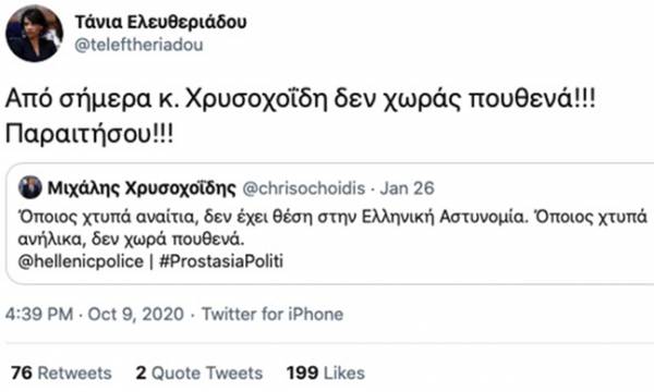 Μετά τη ρίψη χημικών στους μαθητές, η βουλευτής σχολίασε: «Από σήμερα κ. Χρυσοχοΐδη δεν χωράς πουθενά!!! Παραιτήσου!!!»