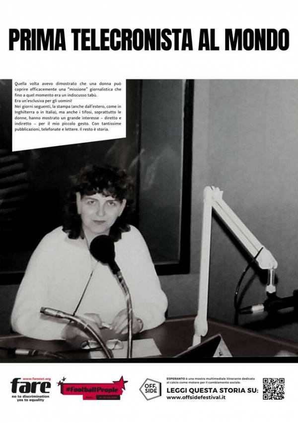 Με τίτλο "Η πρώτη ραδιο/τηλεσχολιάστρια (ποδοσφαίρου) στον κόσμο" και μια φωτογραφία της νεότητάς μου μπροστά σε μικρόφωνο, η έκθεση "ESPERANTO" (με τη συμβολή της διεθνούς "offside.community") με "συστήνει" στους Ιταλούς και στους επισκέπτες της μεγαλούπολης του ιταλικού Βορρά -σχεδόν 38 χρόνια αφ' ότου έκανα την πρώτη μου ραδιοφωνική μετάδοση ποδοσφαίρου για το Β' Πρόγραμμα της Ελληνικής Ραδιοφωνίας (ΕΡΤ), στις 19 Ιουνίου 1983.