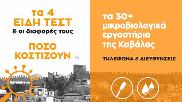 Σε ιδιώτες γίνονται εδώ και μερικές εβδομάδες τα περισσότερα τεστ κορωνοϊού στο νομό Καβάλας (πολλαπλάσια από αυτά που γίνονται στο Νοσοκομείο). Υπολογίζεται ότι σε καθημερινή βάση, σε δεκάδες εργαστήρια σε Καβάλα, Παγγαίο, Νέστο και Θάσο γίνονται περισσότερα από 300 τεστ. ΔΕΙΤΕ λεπτομέρειες ΕΔΩ.
