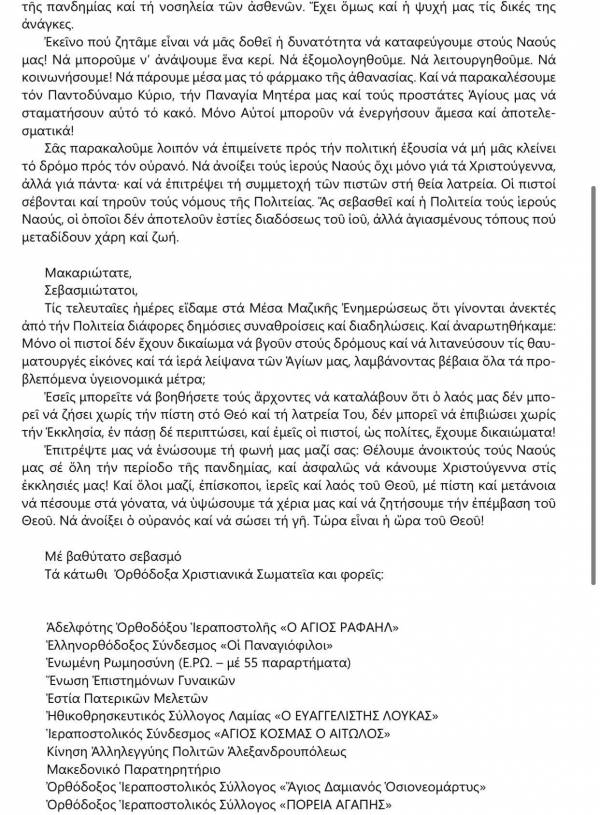 Την επιστολή, υπογράφουν 180 χριστιανικά σωματεία από όλη την Ελλάδα. Μεταξύ άλλων ζητούν από την Κυβέρνηση να τους επιτραπεί να επισκεφθούν τους ναούς και να τελέσουν τα θρησκευτικά τους καθήκοντα. “Εκείνο που ζητάμε είναι να μας δοθεί η δυνατότητα να καταφεύγουμε στους Ναούς μας! Να μπορούμε ν’ ανάψουμε ένα κερί. Να εξομολογηθούμε. Να λειτουργηθούμε. Να κοινωνήσουμε!”