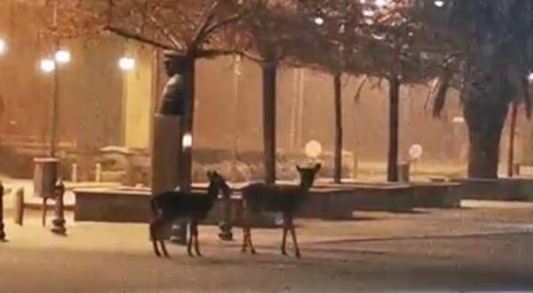 Αν και η εμφάνιση των ελαφιών τα γνωστά πλατώνια, σε διάφορα σημεία της Μύρινας είναι ένα σύνηθες φαινόμενο για τους κατοίκους του νησιού ωστόσο δυο ελάφια να παίζουν στο χιόνι σπάνια συναντά κάποιος.