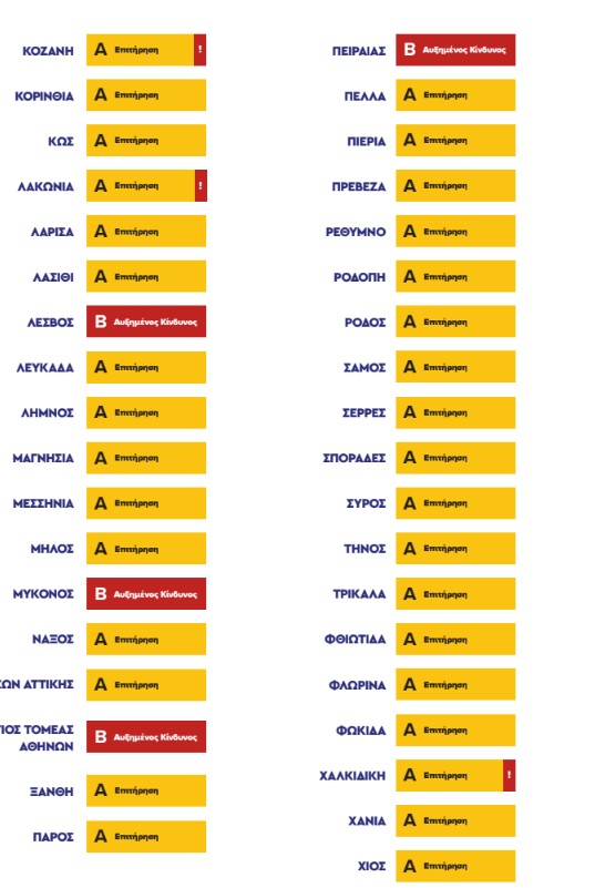Πρόκειται για το επίπεδο επιτήρησης «κίτρινο» και αυξημένου κινδύνου «κόκκινο». Η Αττική και άλλες εννιά περιοχέες βρίσκονται στο «κόκκινο»,