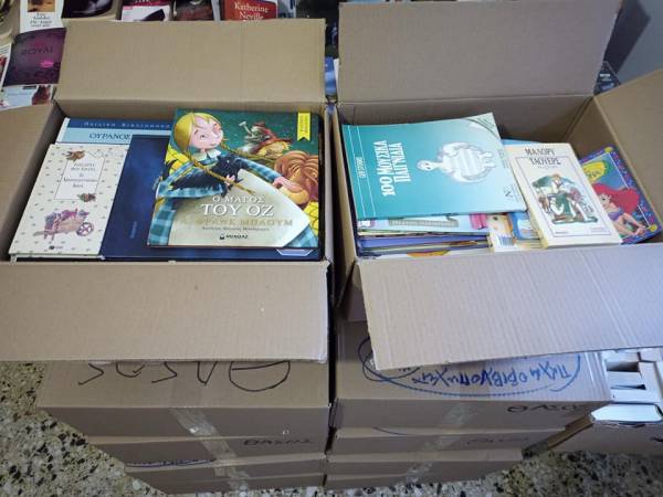 Ως δείγμα εκτίμησης της δουλειάς μας δεν δέχτηκαν να μας στείλουν τα βιβλία παρά μόνο αν μας τα χαρίσουν. Μια παλέτα βιβλία, πάνω από 300 παιδικά βιβλία.