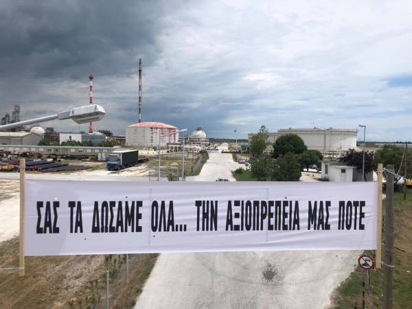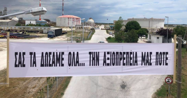 «Σας τα δώσαμε όλα, την αξιοπρέπειά μας ποτέ», αυτό γράφει το πανό το οποίο τοποθέτησαν οι εργαζόμενοι στο δρόμο για τα Πετρέλαια της Καβάλας.
