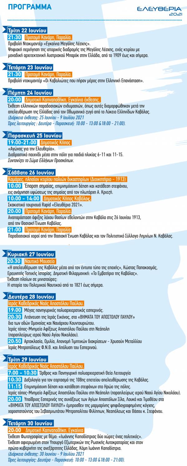 Οι εκδηλώσεις θα έχουν διάρκεια από τις 22 έως τις 30 Ιουνίου σε διάφορα σημεία της Καβάλας και μεταξύ άλλων στην Δημοτική Καπναποθήκη, τον Δημοτικό Κήπο, τις Καμάρες, τον Ιερό Ναό Αποστόλου Παύλου και το Ναυτικό Μουσείο.
