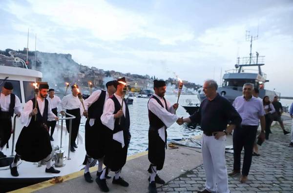Τη στιγμή που το άγημα αποβιβάστηκε τους άνδρες υποδέχθηκαν οι Αρχές της πόλης, ενώ κοπέλες με παραδοσιακές φορεσιές τους έραναν με φύλλα δάφνης και ελιάς.