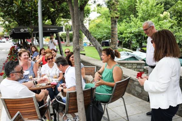 Πρόσχαρη και φιλική δεν δίστασε να συνομιλήσει με Καβαλιώτες που συνάντησε τυχαία να πίνουν τον απογευματινό τους καφέ.