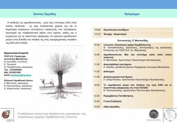Ημερίδα με θέμα «Αγροδασοπονία: Μια νέα χρήση γης στα πλαίσια της ΚΑΠ 2015-2020» διοργανώνουν την Παρασκευή 5 Ιουνίου 2015 στην αίθουσα Εκδηλώσεων Δημοτικής Βιβλιοθήκης Καβάλας το Γεωτεχνικό επιμελητήριο Παράρτημα Ανατολικής Μακεδονίας, το Ελληνικό Αγροδασικό Δίκτυο και ο Δήμος Καβάλας.
