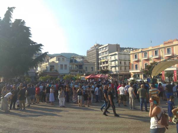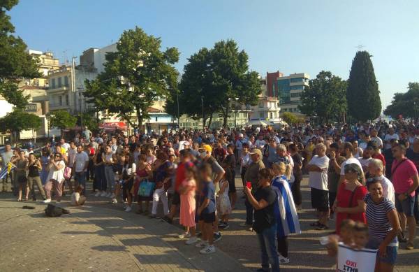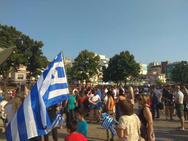 Πλήθος κόσμου, οι περισσότεροι χωρίς μάσκα, συγκεντρώθηκε στην πλατεία Ελευθερίας της πόλης, μια εβδομάδα μετά τη μεγάλη συγκέντρωση της προηγούμενης Τετάρτης (δες ΕΔΩ).