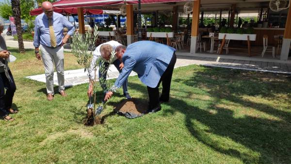 Στη συνέχεια ο Δήμαρχος Θάσου και ο Υφυπουργός μετέβησαν σε κεντρικό χώρο πρασίνου του Λιμένα Θάσου, όπου από κοινού φύτευσαν συμβολικά ένα νεαρό δενδρύλλιο Ελιάς Εις Μνήμην του Holger Dembek, στελέχους της Ελληνογερμανικής Συνέλευσης που απεβίωσε πρόσφατα.
